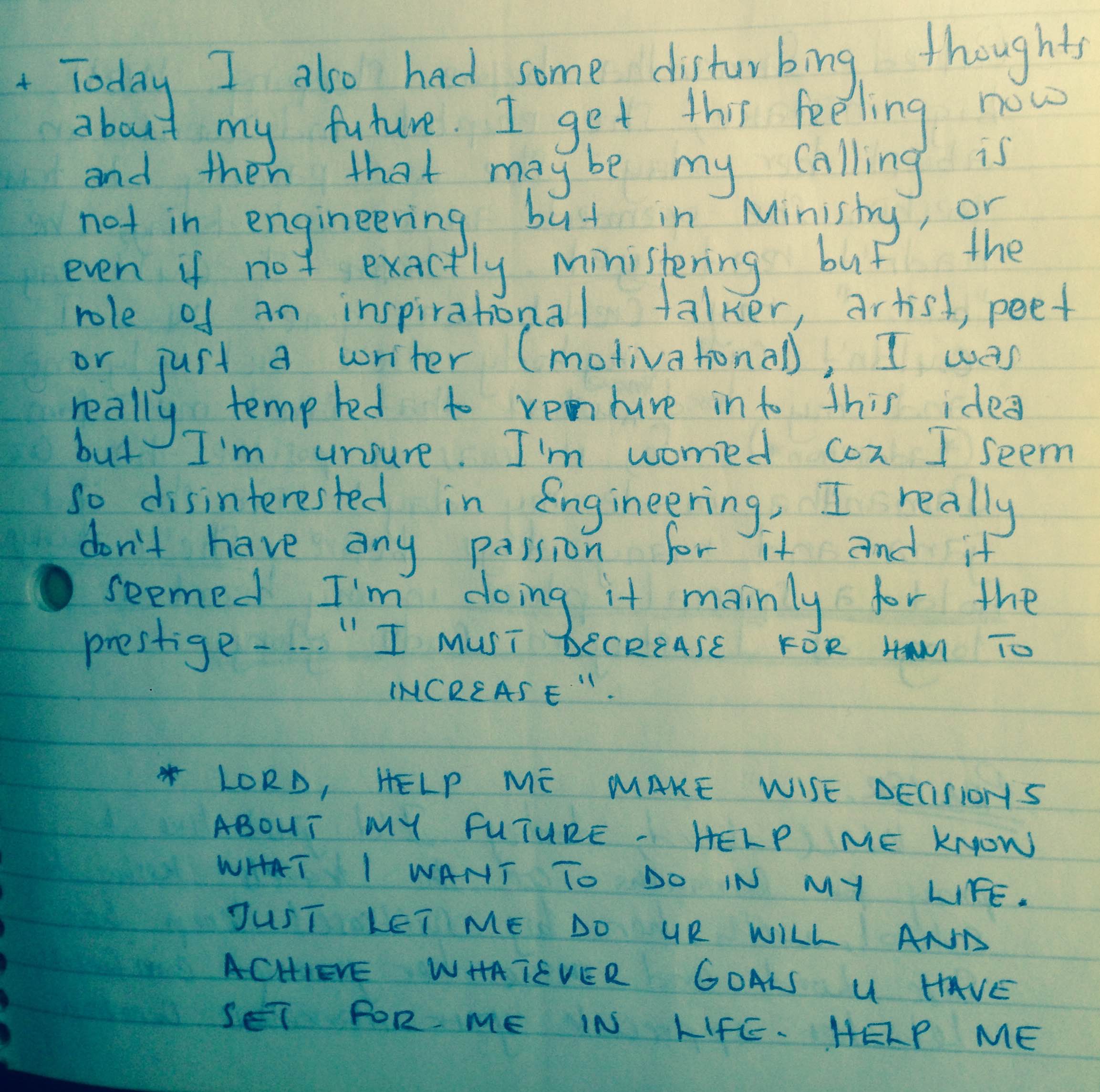 “Today I also had some disturbing thoughts about my future. I get this feeling now and then that maybe my calling is not in Engineering but in ministry, or even if not exactly ministering (by this I meant working in a church organization), but the role of an inspirational *talker, artist, poet or just a writer (motivational).